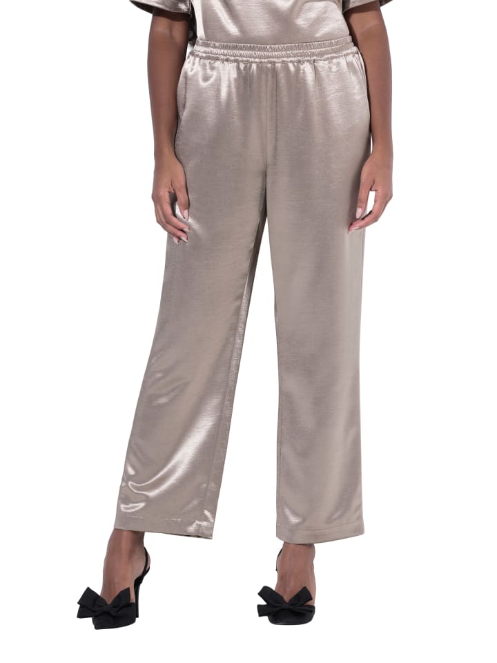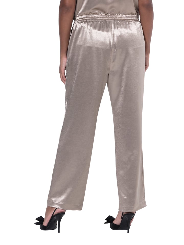 Широкие, слегка расклешенные брюки из мерцающего золотистого креп-сатина. Эластичный пояс, боковые карманы.