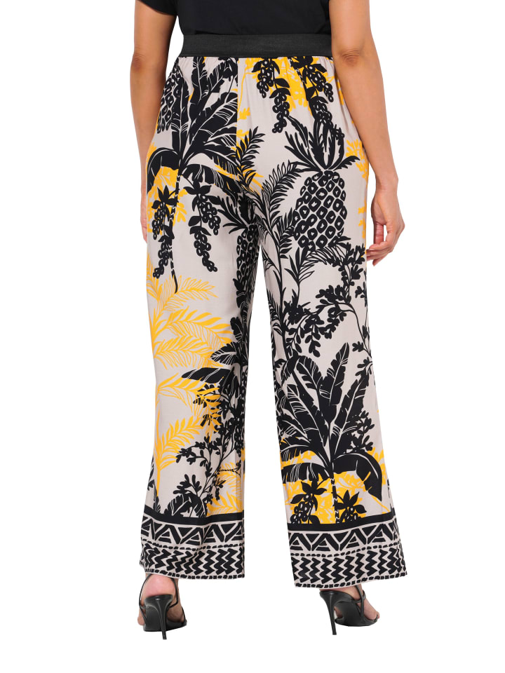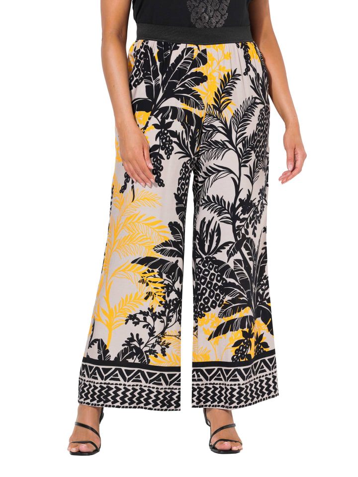 Широкие прямые брюки из мягкой вискозы с цветным рисунком пальм и каймой по низу. Эластичный пояс с боковыми карманами.