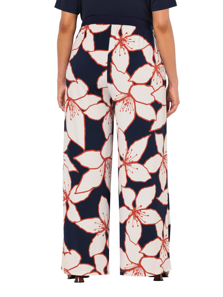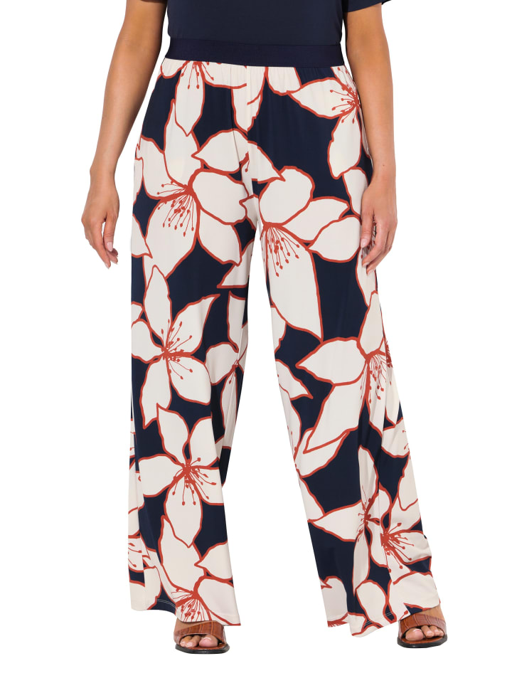 Широкие прямые брюки из мягкого трикотажа с цветочным рисунком. Эластичный пояс, боковые карманы.
