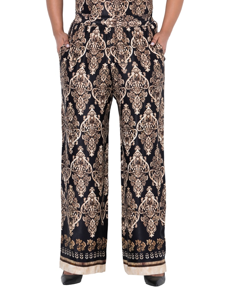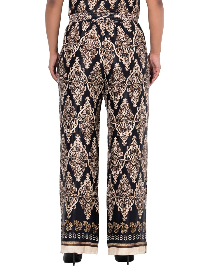 Широкие брюки прямого кроя из мерцающего вискозного атласа с модным дизайном и каймой по низу. Эластичный пояс, боковые карманы.