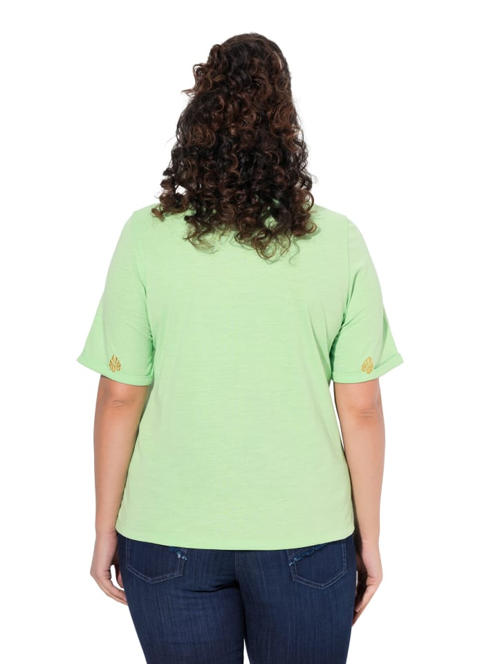 Футболка классического кроя из мягкого трикотажа с приятной текстурой. Низ на кулиске с завязкой обеспечит вам желаемый силуэт. Фотопринт с пальмой и золотыми пайетками, вырез в форме сердца и короткие рукава с вышивкой блестками на отвороте.