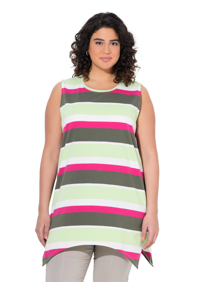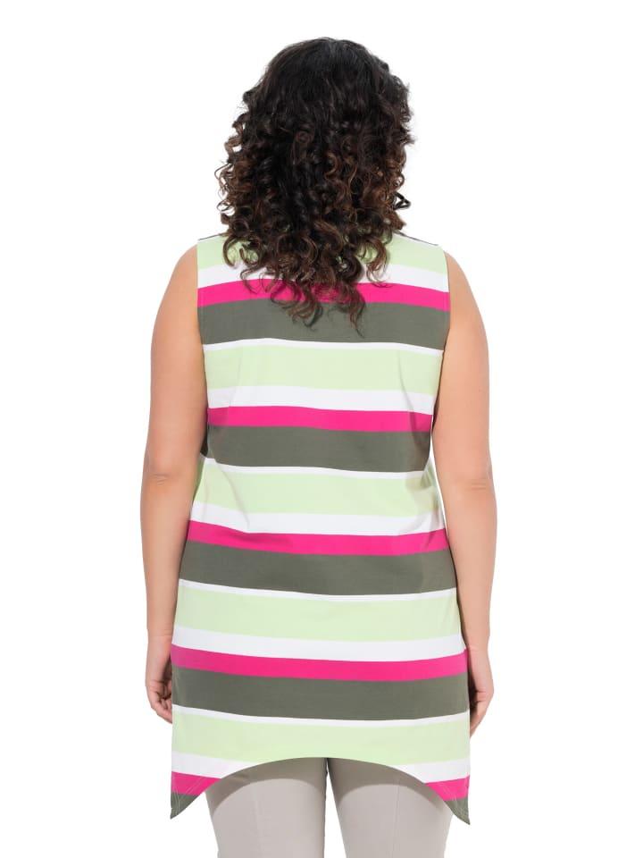 Длинный топ, удлиненный А-силуэт, из мягкого трикотажа с полосками, заостренный низ с боковыми разрезами для еще большего комфорта. Круглый вырез, без рукавов.