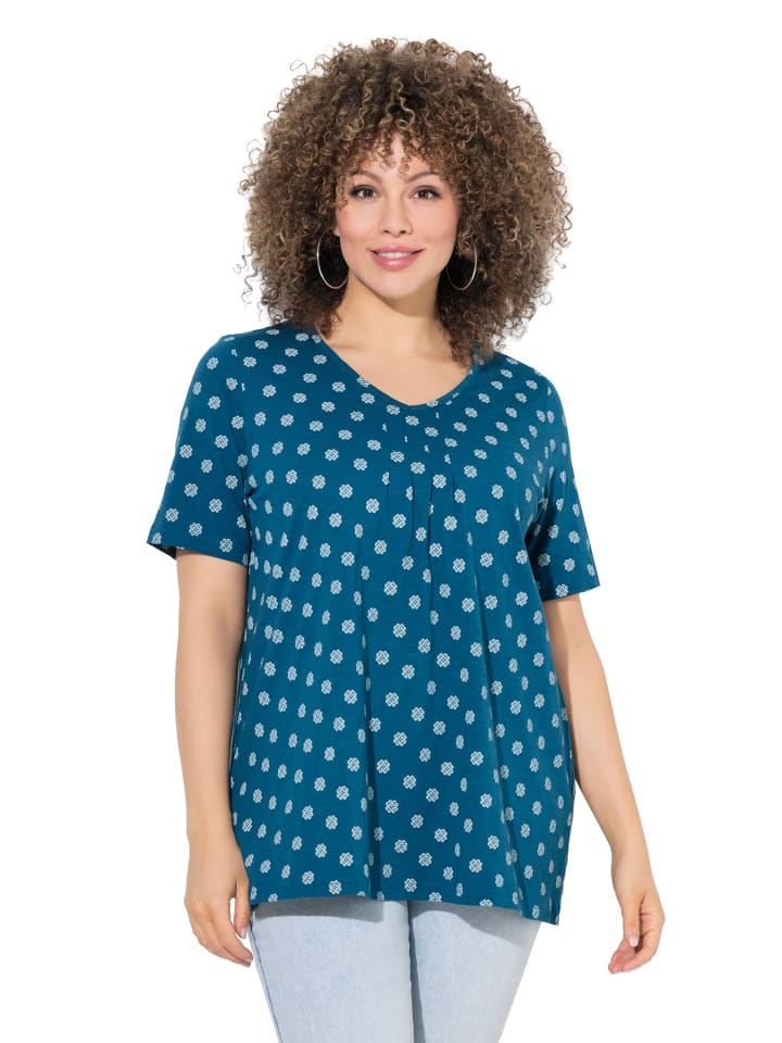 Футболка А-силуэта из мягкого трикотажа с тонкой текстурой и рисунком. Округлый V-образный вырез с кантом и короткие рукава.
