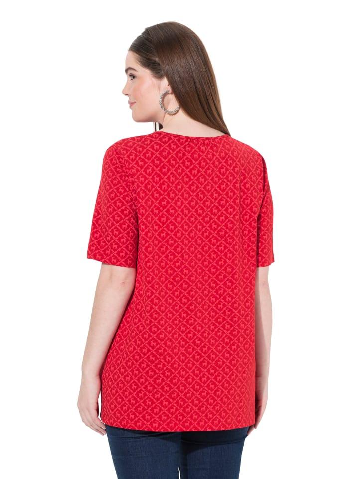Футболка А-силуэта с современным традиционным узором. Комфортный эластичный трикотаж с декоративными складками на V-образном вырезе. Короткие рукава.