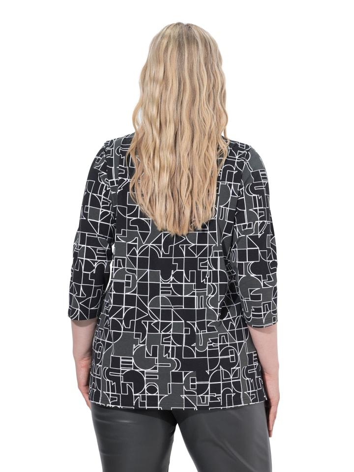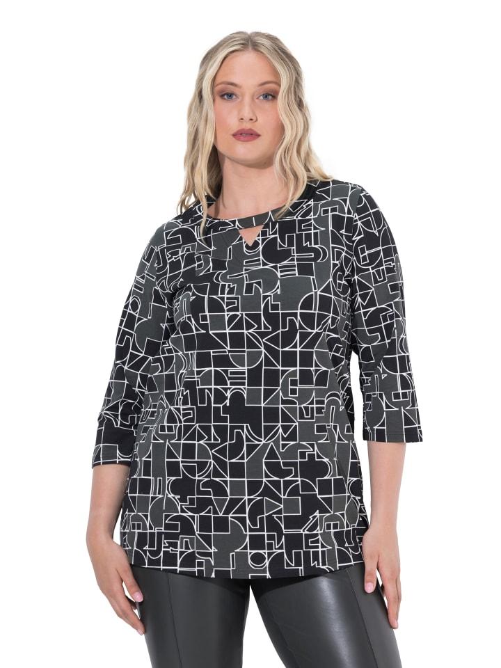 Футболка классического кроя из комфортного эластичного трикотажа с графическим рисунком. Круглый вырез горловины с небольшим вырезом-замочной скважиной, рукава длиной 3/4.
