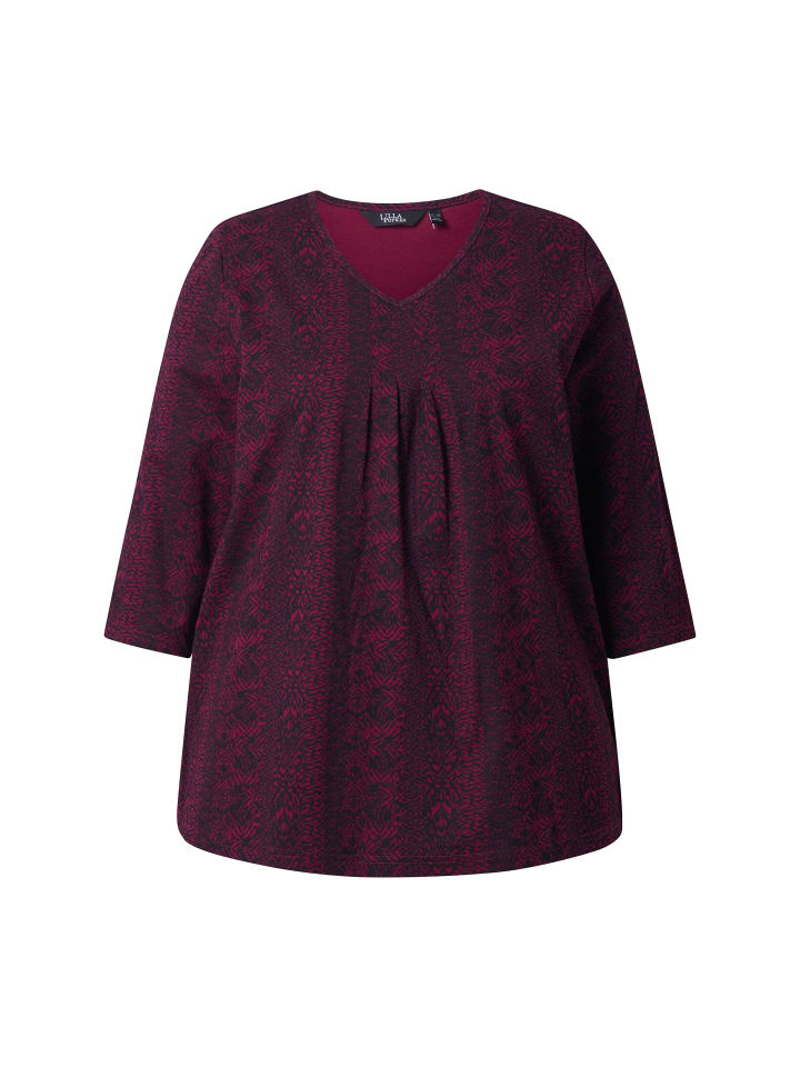 Футболка А-силуэта из мягкого трикотажа с современным рисунком. V-образный вырез с декоративными складками, рукава длиной 3/4.