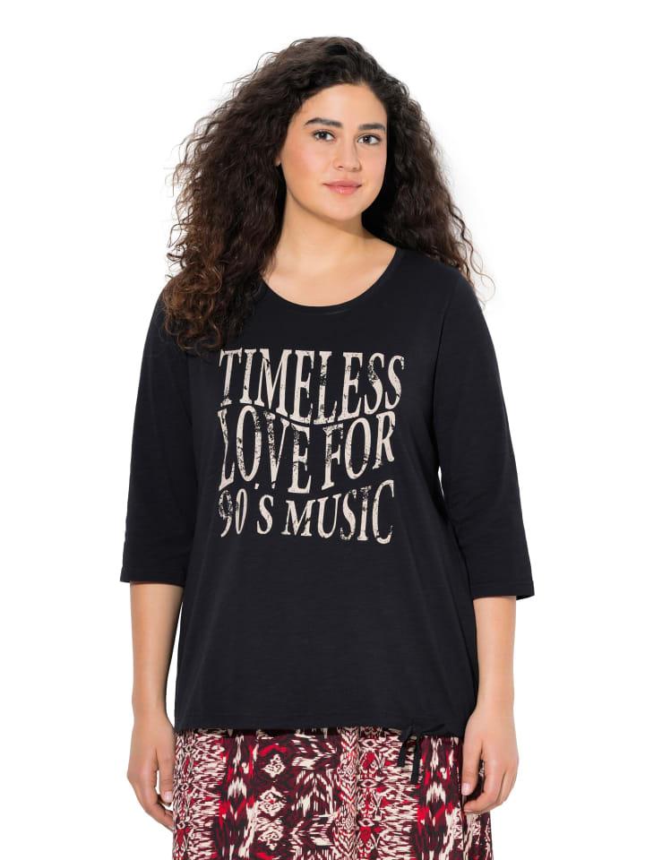 Футболка Classic Fit из мягкого трикотажа с крупной надписью. Круглый вырез, рукава 3/4. Завязка по низу - всегда ваш желаемый силуэт.