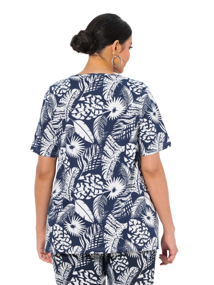 Футболка А-силуэта из мягкого трикотажа с рисунком в виде перьев. Декоративные швы под V-образным вырезом. Короткие рукава.