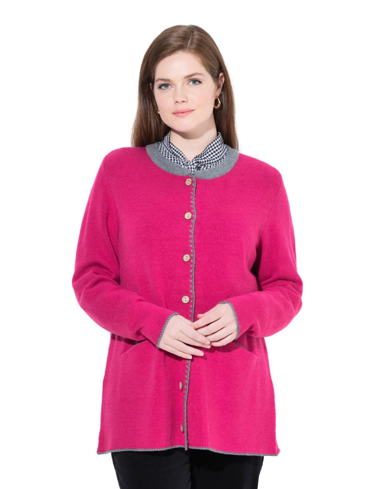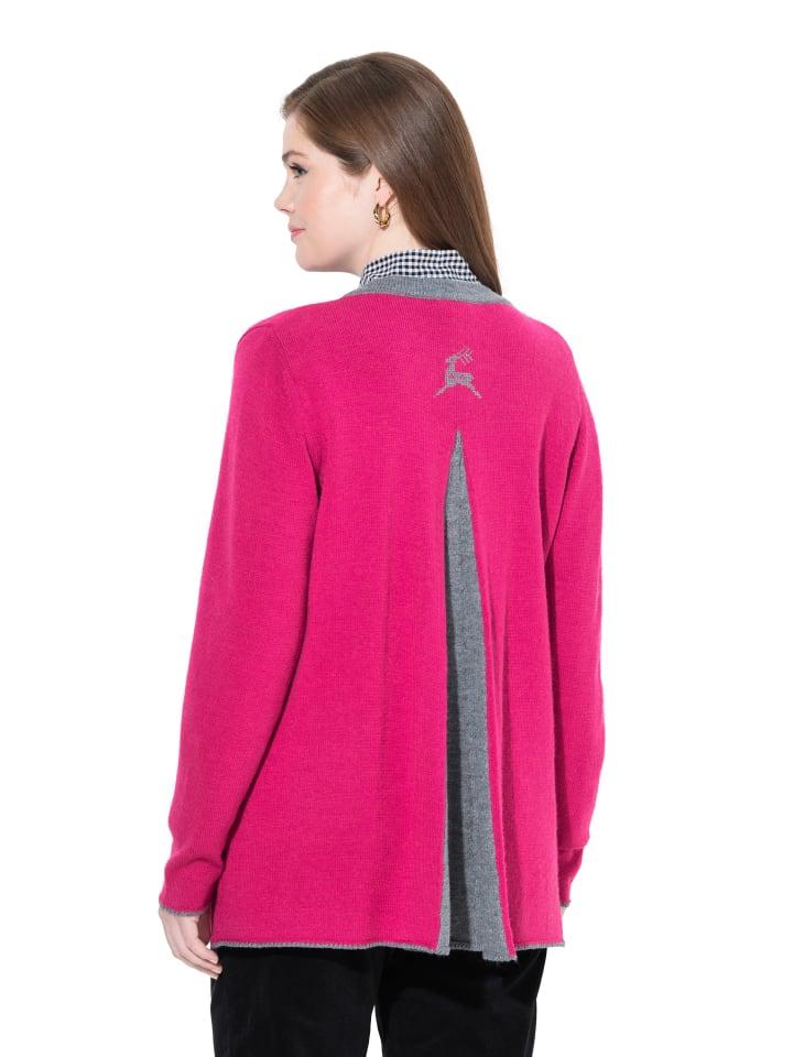 Длинный кардиган А-силуэта из мягкой тонкой пряжи. Особенности: спинка с цветной декоративной складкой и вышитым изображением оленя. Круглый вырез и традиционная планка с пуговицами. Два кармана, длинные рукава и подол с цветной окантовкой.