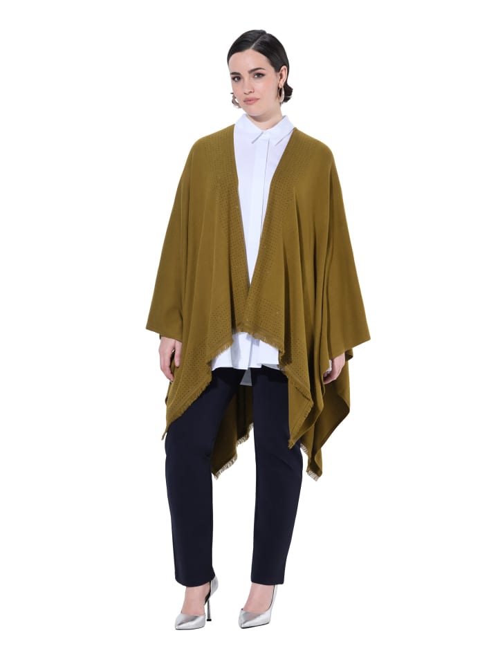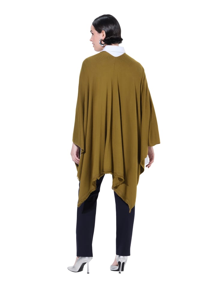 Вязаное пончо свободного кроя с добавлением кашемира - мягкая вискозная пряжа тонкого плетения, создающая особый уют. Изюминка: передний край и низ украшены элегантными декоративными камнями. Современный, свободный крой с широкими спущенными плечами.