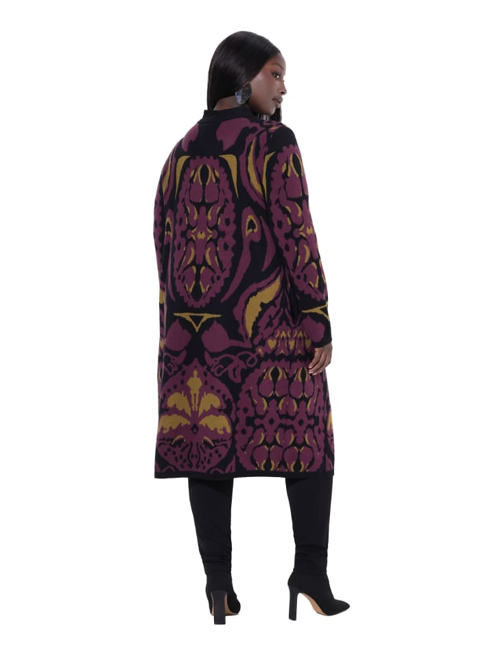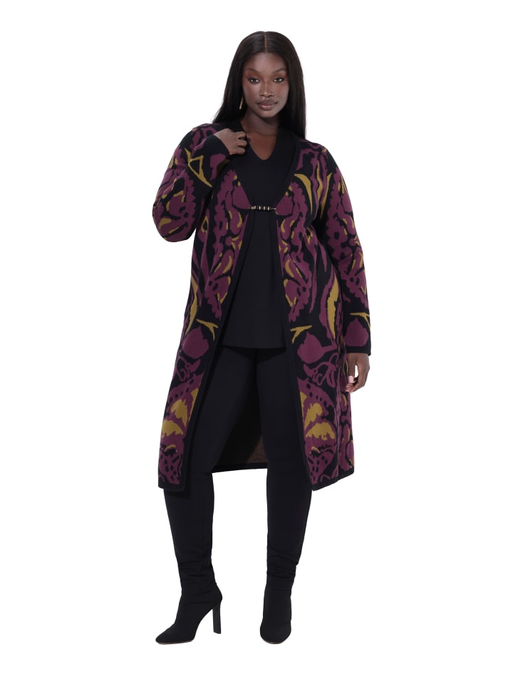 Длинный кардиган, удлиненный, классического кроя, выполнен из мягкой смесовой вискозы тонкой вязки с ярким жаккардовым узором - аккуратная вязка, без торчащих ниток. Современный жакет свободного кроя со съемной декоративной застежкой на булавку, V-образным вырезом и длинными рукавами. Карманы в боковых швах.