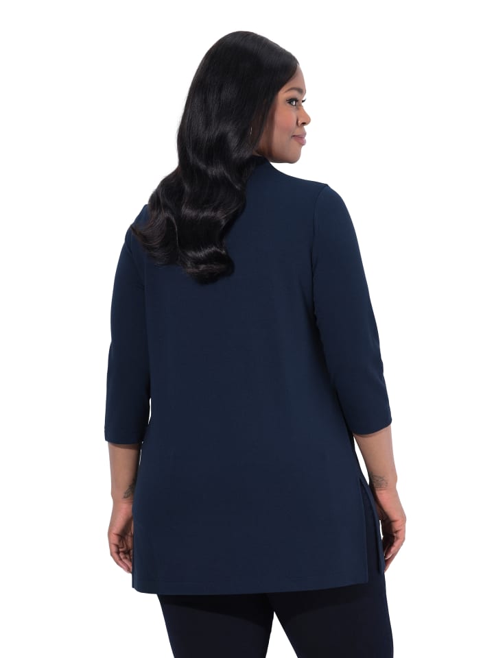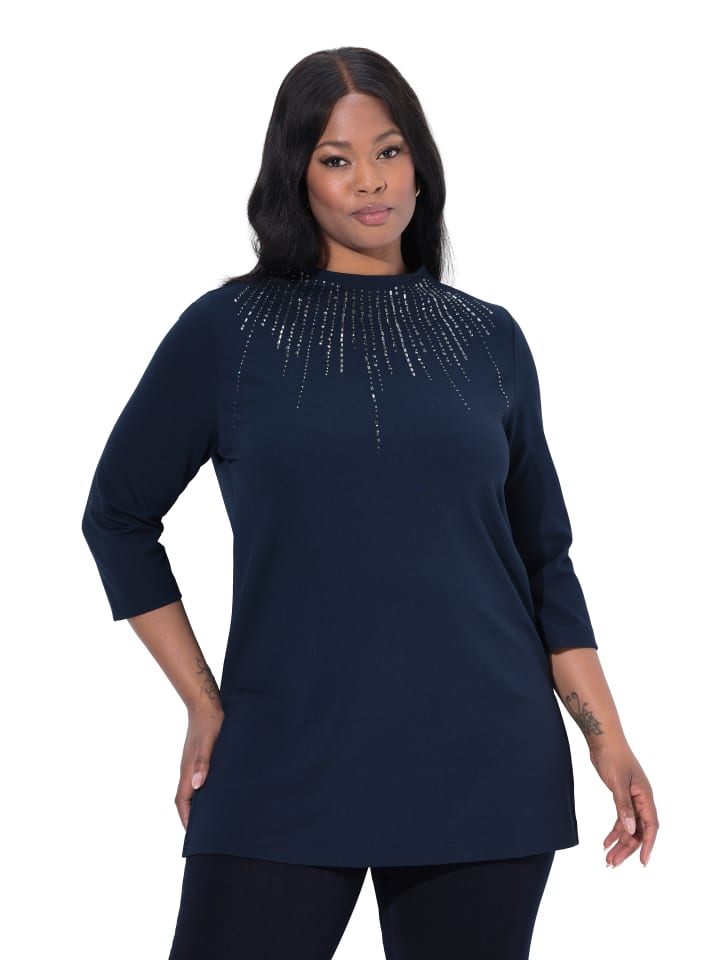 Толстовка А-силуэта из высококачественного трикотажа с эффектными, элегантными блестящими лучами на воротнике-стойке. Длинные рукава и длинные боковые разрезы для современного образа и максимального комфорта.