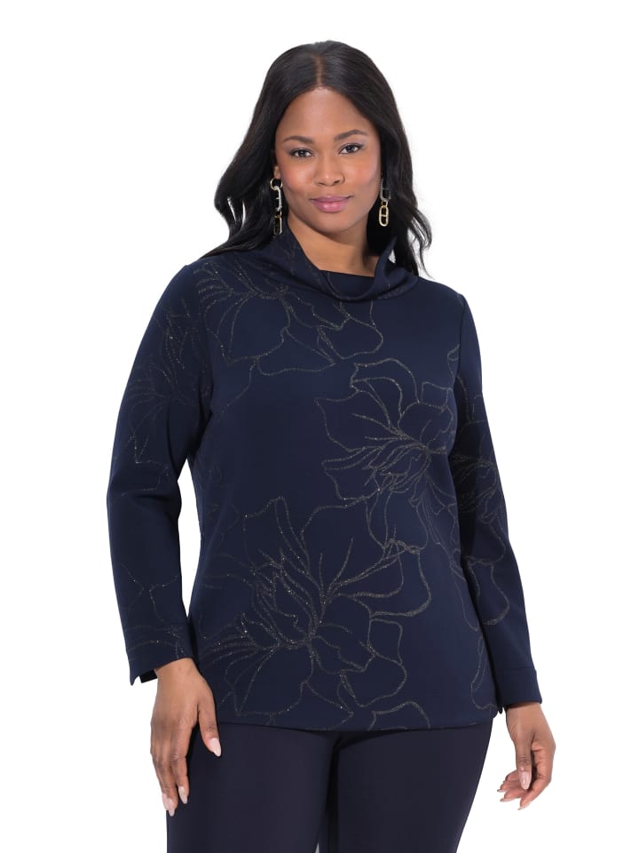 Толстовка классического кроя из мягкого модального трикотажа с мелким блестящим цветочным рисунком. Мягкий воротник-стойка, короткие рукава. Боковые разрезы для большего комфорта.