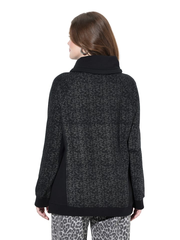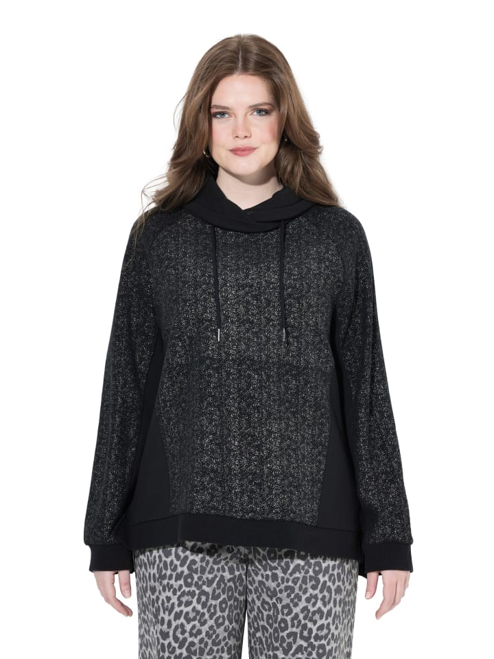 Толстовка удобного кроя из трикотажной смеси - однотонная с легким блеском. Воротник-стойка с завязкой, длинные рукава реглан, манжеты в рубчик и боковые разрезы для еще большего комфорта.