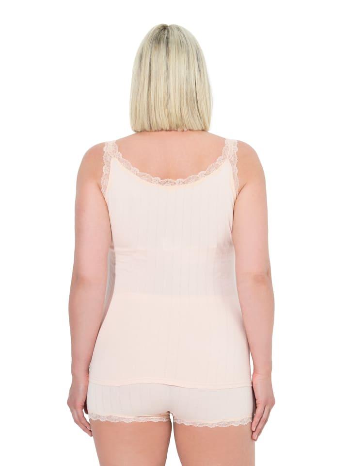 Майка проверенного кроя из тонкого трикотажа с ажурными полосками и кружевом на вырезах и бретелях.