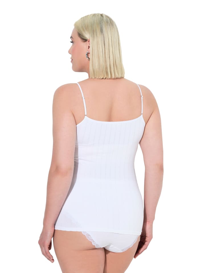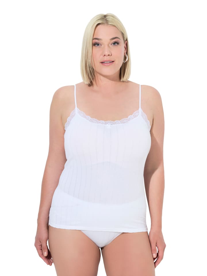 Майка облегающего кроя на тонких бретельках из тонкого трикотажа с ажурным узором и кружевной отделкой. Регулируемые бретельки.