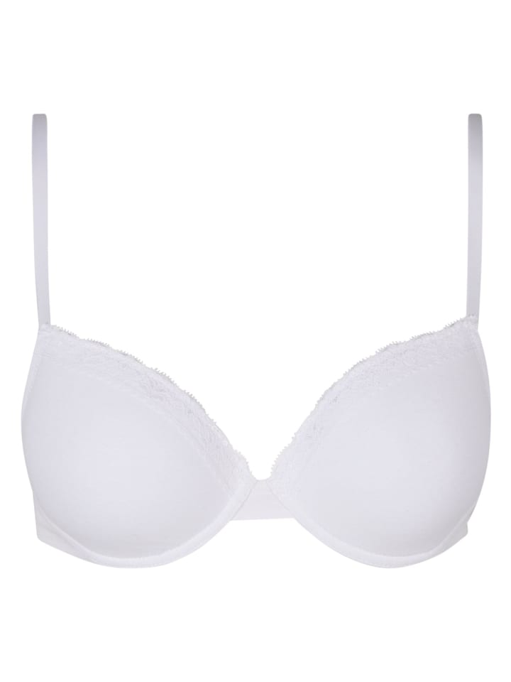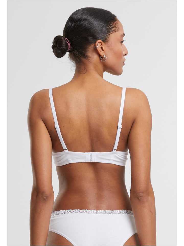 Бюстгальтер с подкладкой для повседневной носки. Благодаря облегающему крою и облегающей посадке он служит надежным поддерживающим слоем. Изготовленный из легкого эластичного хлопкового трикотажа, он обеспечивает комфорт и легкую поддержку благодаря формованным чашкам и легкой подкладке, которая корректирует силуэт. Узкие бретельки создают четкий вырез, а нежная кружевная отделка в верхней части чашечек добавляет женственности. Бюстгальтер отличается лаконичным дизайном с формованными чашками и гладкой зоной под грудью, которая едва заметна под одеждой, что делает его подходящим как для повседневной носки, так и в качестве незаметной основы под облегающим топом.
