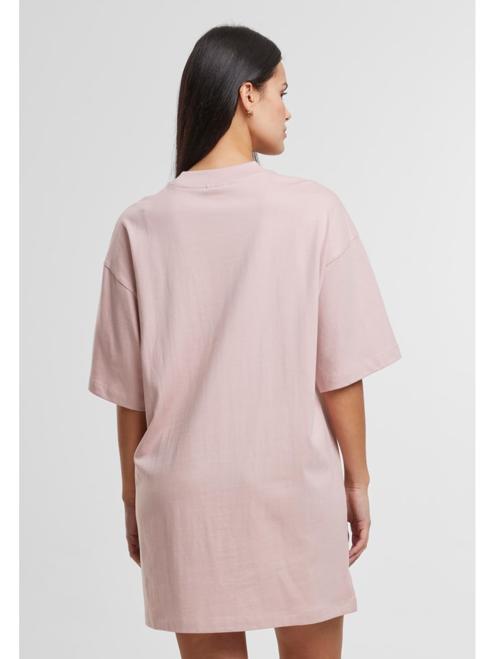 Это платье однотонного цвета и лаконичного кроя, напоминающего футболку. Короткие широкие рукава скошены и спущены. Короткая длина мини и слегка разрезанный подол чувственно дополняют этот образ. Это женское платье также имеет боковые карманы и небольшой круглый вырез в рубчик. Ребристые манжеты на рукавах и подол дополняют городской стиль. Платье выполнено из высококачественного органического хлопка и имеет свободный крой.