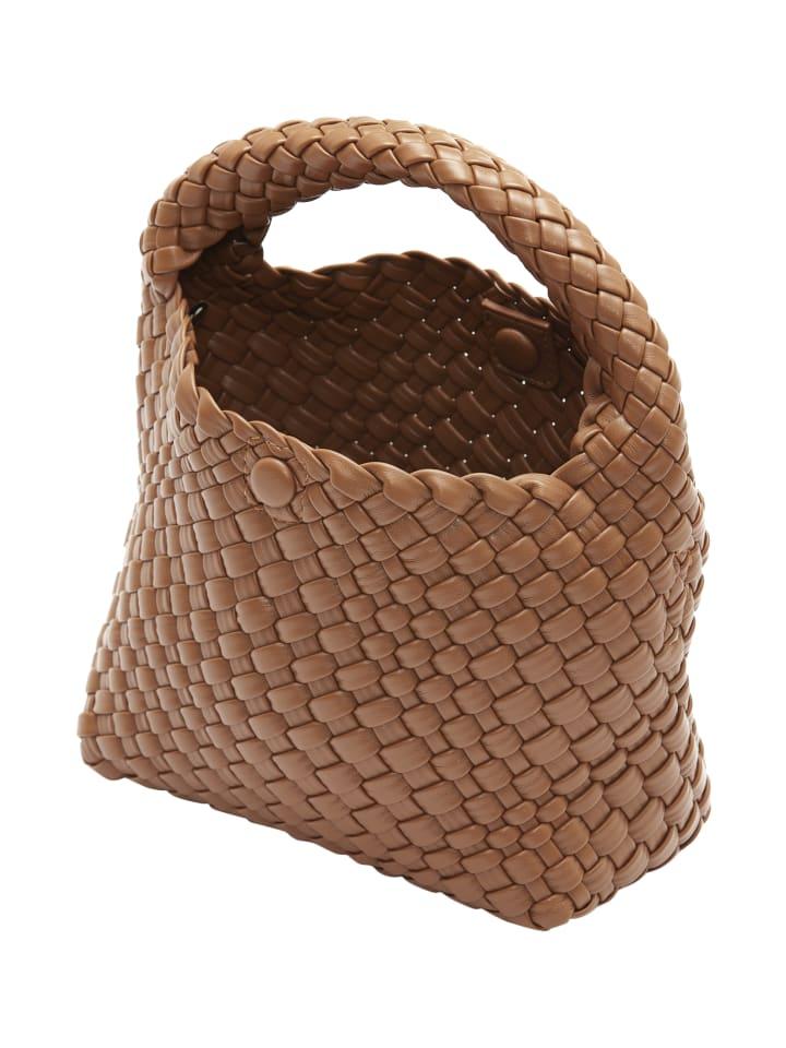 Эта сумка 2 в 1 с характерным фактурным плетеным узором имеет трапециевидную форму и ручку сверху для удобства переноски. Она оснащена регулируемым и съемным ремешком для универсальности. Вместительное основное отделение застегивается на кнопку, а дополнительный мешочек обеспечивает надежное хранение небольших предметов первой необходимости. Разработанная совместно с SIDONA, эта модель сочетает в себе классический стиль и современный дизайн.