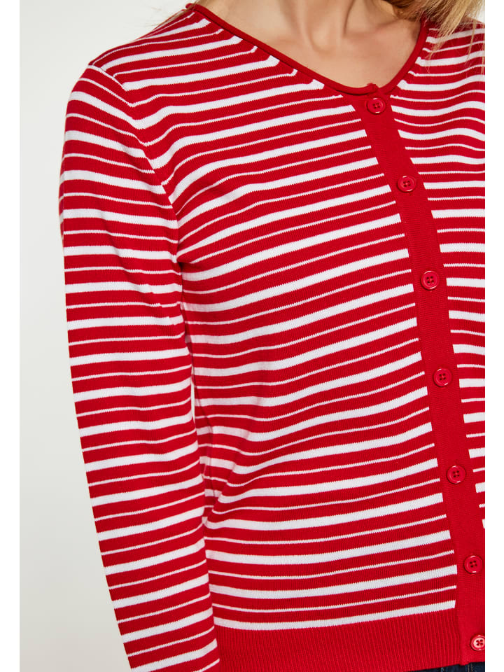 Представляем нашу новинку для вашего гардероба - незаменимый кардиган в горизонтальную полоску с круглым вырезом. Этот кардиган с длинными рукавами, выполненный в резинке, отличается комфортом и стильным дизайном. Застежка на пуговицы по всей длине добавляет изысканности этой универсальной модели. Разработанная совместно с SANIKA, эта модель сочетает в себе классический стиль и современный дизайн.