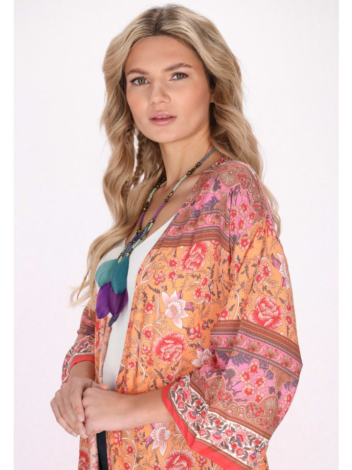 Откройте для себя потрясающее платье-кимоно макси-длины с ярким цветочным узором, развевающимся круглым вырезом и стильными рукавами-кимоно 3/4, воплощающими стиль бохо. Завязка на талии создает классический силуэт. Изящные акценты в стиле кимоно на манжетах и подоле придают этому летнему наряду очаровательный праздничный вид. Это изделие из коллекции Boho Fashion.