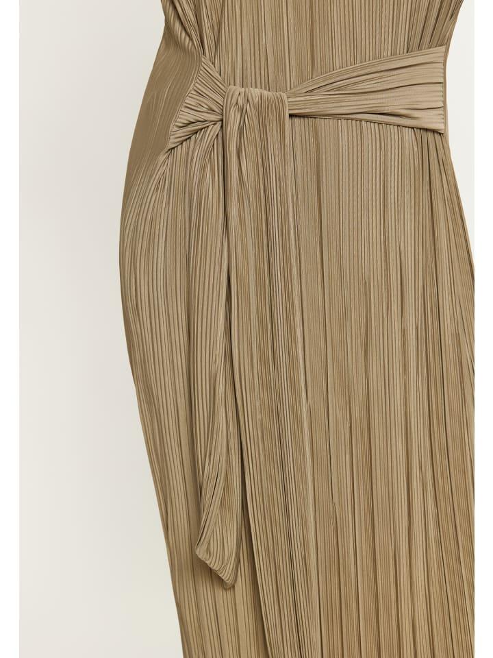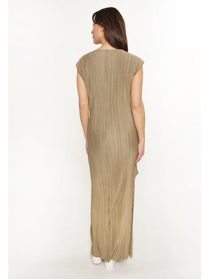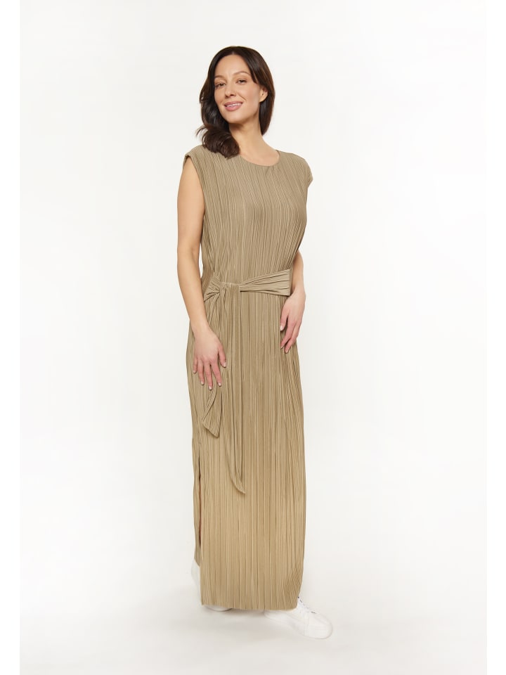 Откройте для себя элегантность этого плиссированного платья из нашей коллекции Fashion Look. Это макси-платье с прямым кроем, круглым вырезом и рукавами-крылышками излучает непринужденный шарм. Вшитый пояс стягивает талию для идеальной посадки, а трикотажные вертикальные складки подчеркивают стильный дизайн - идеальный вариант для модниц, ценящих комфорт и изысканность.