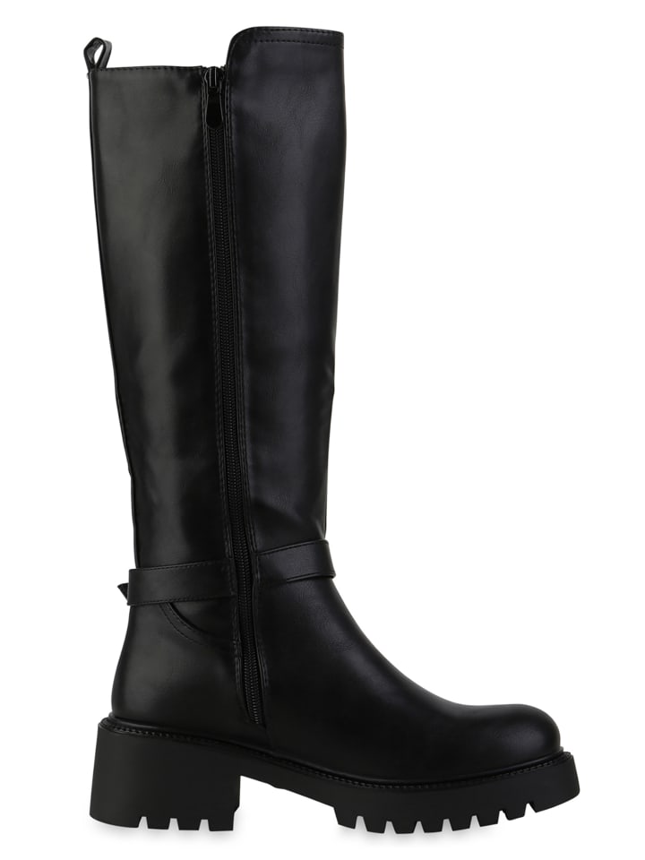 - Яркий байкерский вид ботинок стильно подчеркнут декоративными пряжками и прочными элементами.