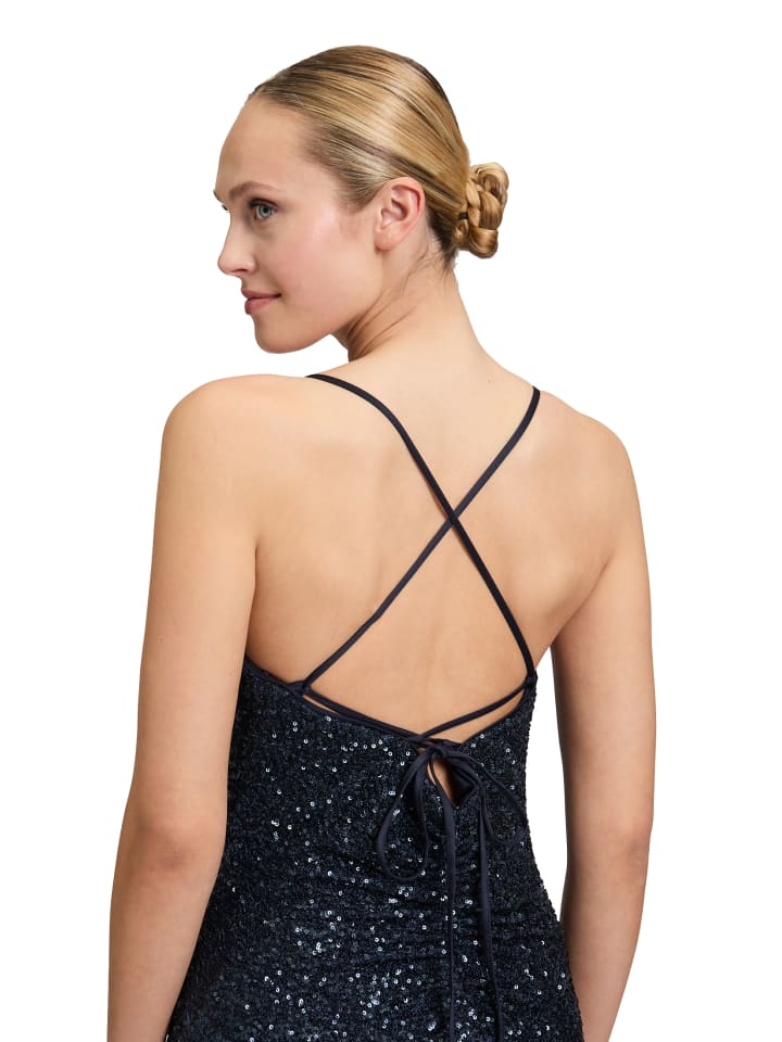 Настоящая приманка для глаз! Это облегающее вечернее платье из струящегося материала идеально подчеркнет ваш силуэт. Изысканные оборки и элегантный разрез создают женственный образ с особым шармом. Узкие бретельки-спагетти и изящная молния стильно дополняют простой фасон. Идеально подходит для тех, кто хочет блистать на торжественных мероприятиях.