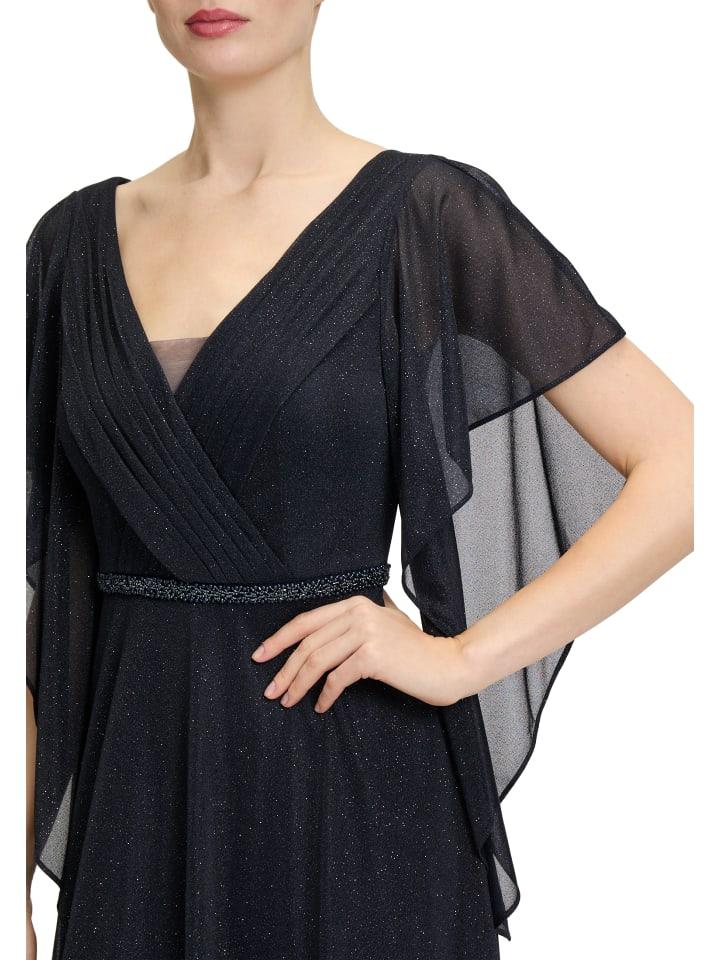 Это вечернее платье - настоящая приманка для глаз, и вы будете сиять! Изящная вышивка на нежной сетчатой ткани придает ему особую элегантность, а складки и слегка приталенный крой выгодно подчеркивают вашу фигуру. V-образный вырез и элегантные рукава с воланами подчеркивают женственность платья. Это однотонное платье с короткими рукавами и практичной застежкой-молнией - идеальный выбор для торжественных случаев, когда вы хотите блистать.