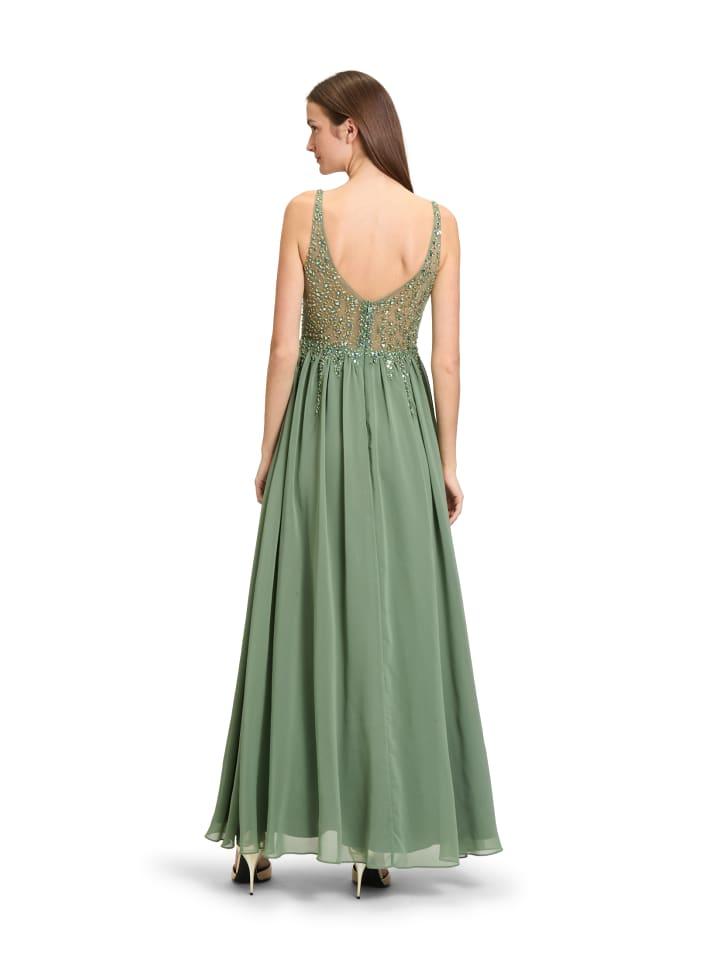 Это праздничное вечернее платье макси-длины с элегантным V-образным вырезом и без рукавов создает гламурный образ. Однотонная ткань украшена сверкающими стразами, что придает платью нотку роскоши. Расклешенный крой выгодно подчеркивает фигуру и создает элегантный силуэт. Застежка-молния позволяет легко надевать и снимать платье. Идеально подходит для особых случаев, придавая вашему образу женственность и праздничность.