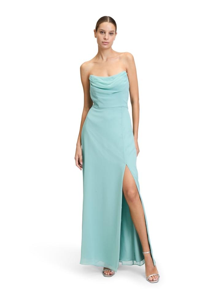 Этот тренд невозможно пропустить! Это праздничное вечернее платье из воздушного шифона сочетает в себе элегантный водопадный вырез, изысканные сборки и высокий разрез. Расклешенный крой создает мечтательно женственный силуэт. Благодаря дополнительным бретелям и практичной молнии платье идеально адаптируется к вашим потребностям - незаменимая вещь для особых случаев!