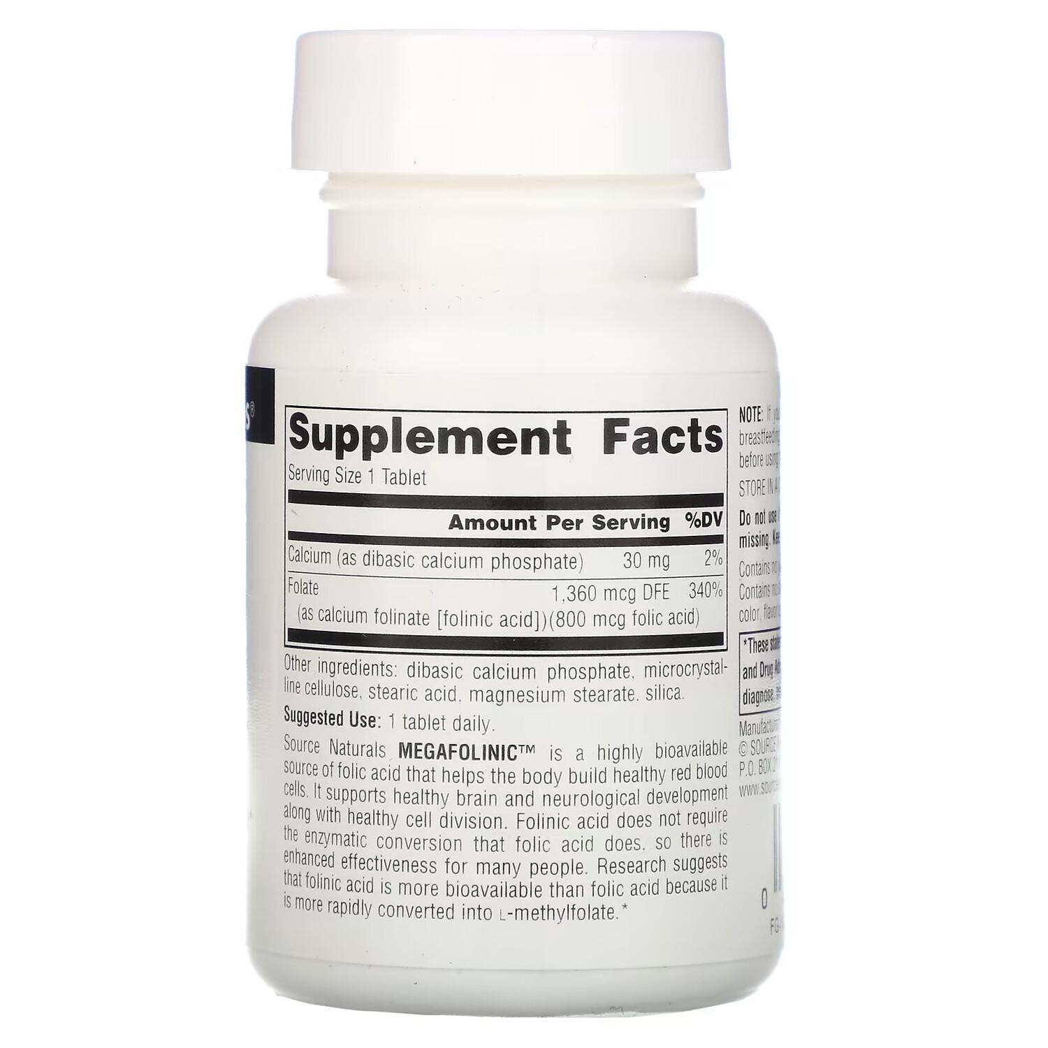 MEGAFOLINIC® от Source Naturals — это биодоступный источник фолиевой кислоты, который помогает организму создавать здоровые эритроциты. Он поддерживает нормальное развитие мозга и нервной системы, а также здоровое деление клеток. В отличие от фолиевой кислоты, фолиновая кислота не требует ферментной обработки, она эффективно действует на организм большинства людей. Ученые полагают, что фолиновая кислота более биодоступная, чем фолиевая, поскольку она быстрее преобразуется в L-метилфолат.