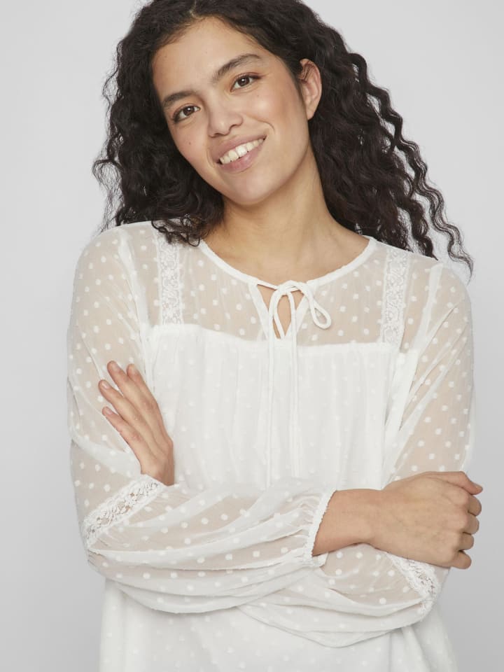 Этот топ с длинными рукавами украшен множеством женственных деталей. Благодаря сетчатому материалу с мелким узором он подойдет как для работы в офисе, так и для приятного вечера.