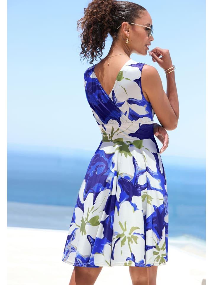 Приталенное мини-платье от Vivance с принтом по всей поверхности. Верх на запах со сборками. Широкий пояс. Расклешенная юбка. Эластичный трикотаж.