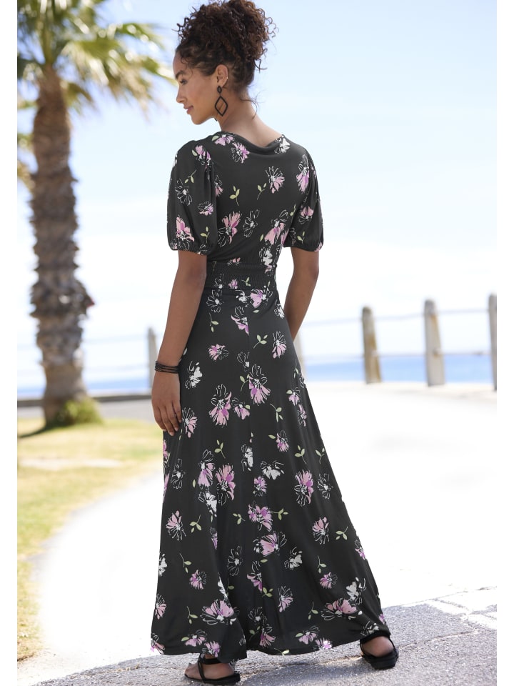 Платье макси от Vivance. Сплошной принт, каждое изделие уникально. Глубокий V-образный вырез. Короткие рукава с эластичным подолом. Присборенная талия. Облегающий крой. Мягкий, струящийся вискозный трикотаж.
