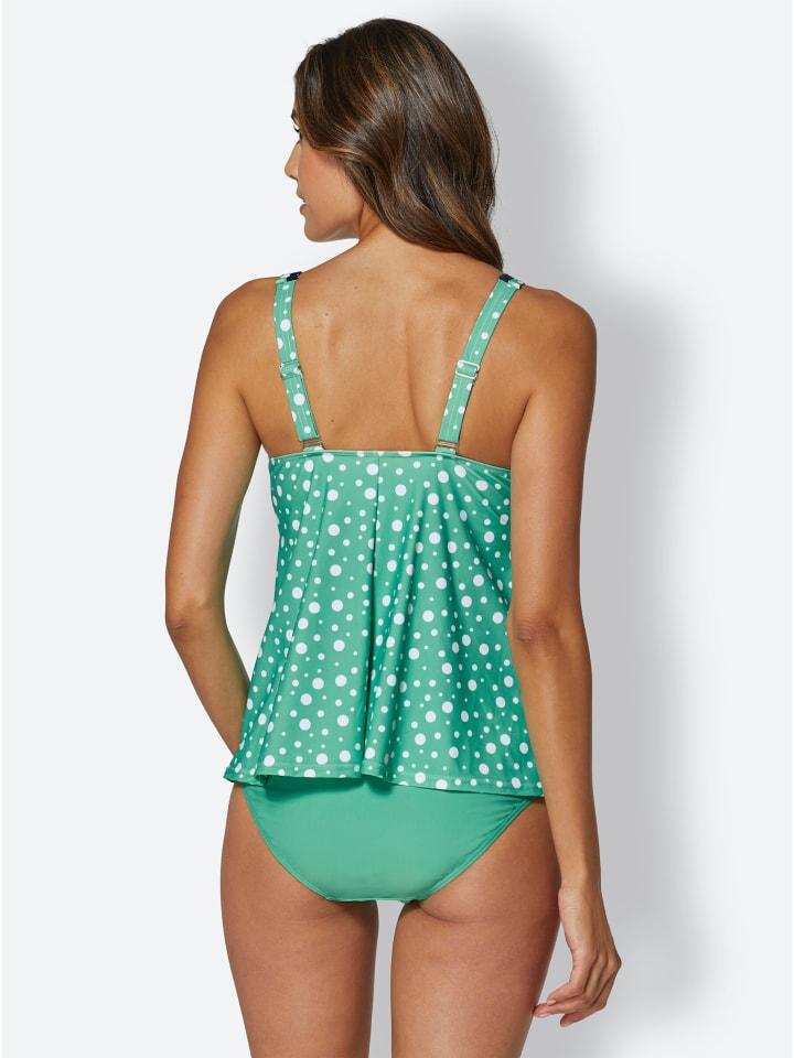Танкини-топ с регулируемыми бретелями и контрастной завязкой под грудью. Мягкие чашки и пояс под грудью.