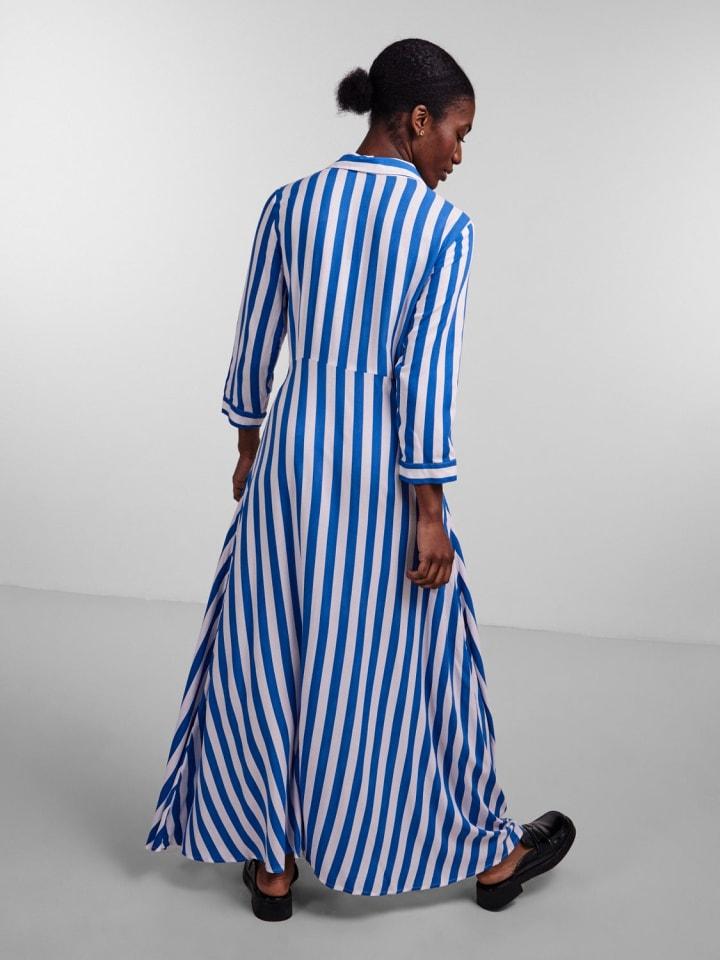 Платье YAS Саванна, в полоску, вискоза, воротник-стойка Кент, отстроченный низ, накладная планка с пуговицами, прямой подол, узор по всей поверхности, струящаяся ткань, застежка на пуговицы, вискоза. На модели размер S. Внешний материал: 100% вискоза.