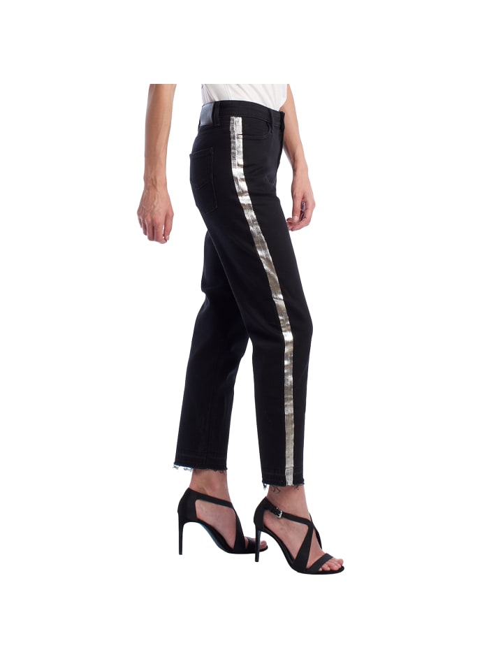 Джинсы с металлизированными полосками по бокам и бахромой по низу.