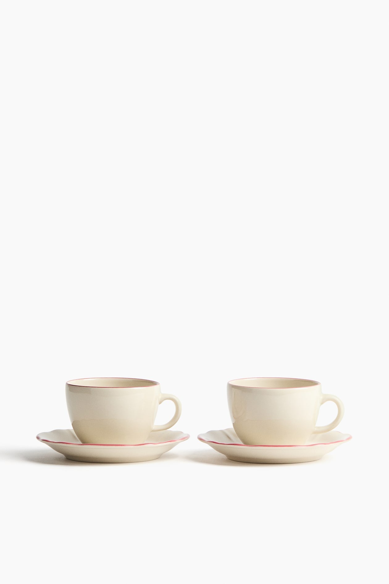 Две старинные керамические чашки с блюдцами и расписанным вручную краем.