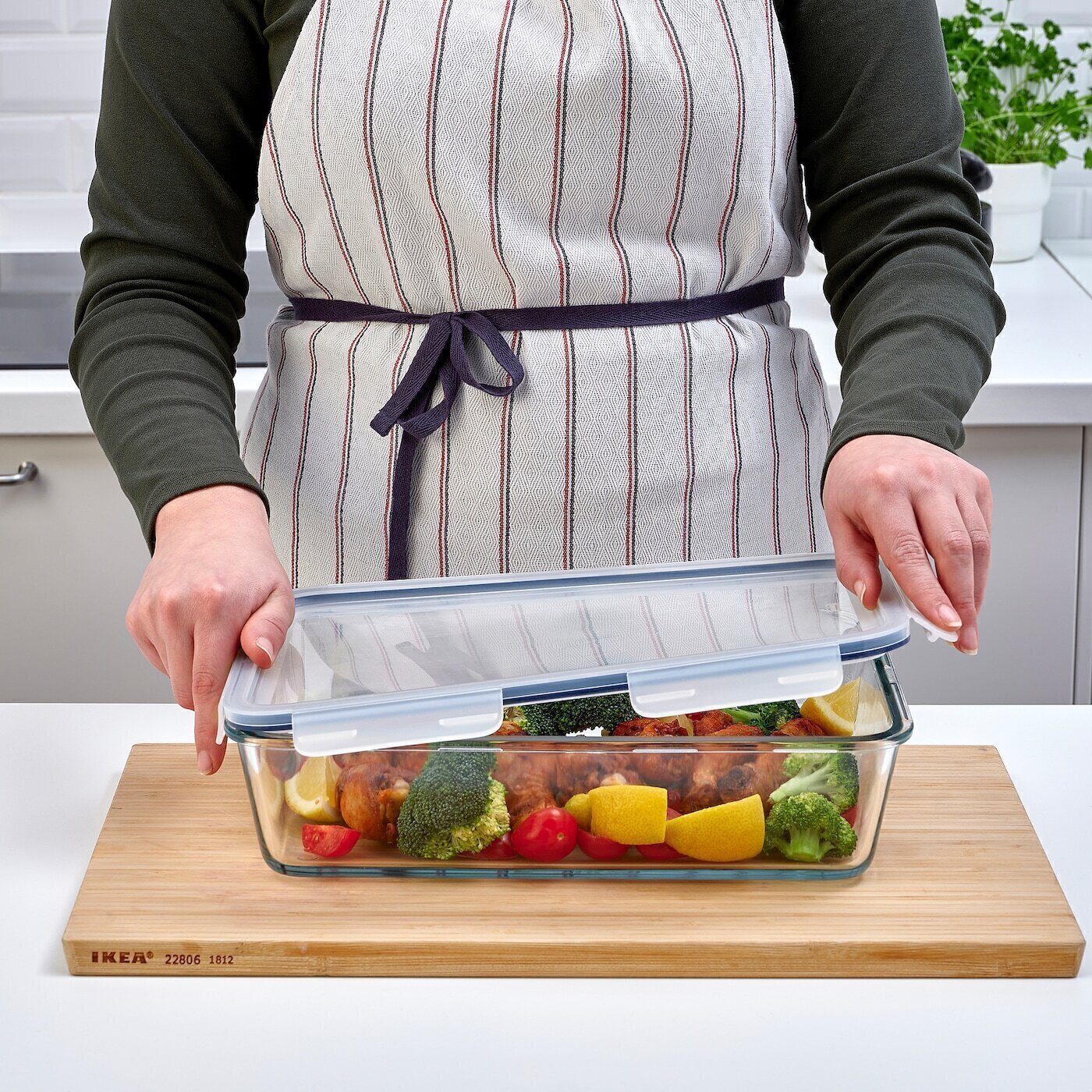 Контейнер для еды изготовлен из стекла, пригодного для использования в духовке, и может использоваться как в духовке, так и в качестве сервировочного блюда.