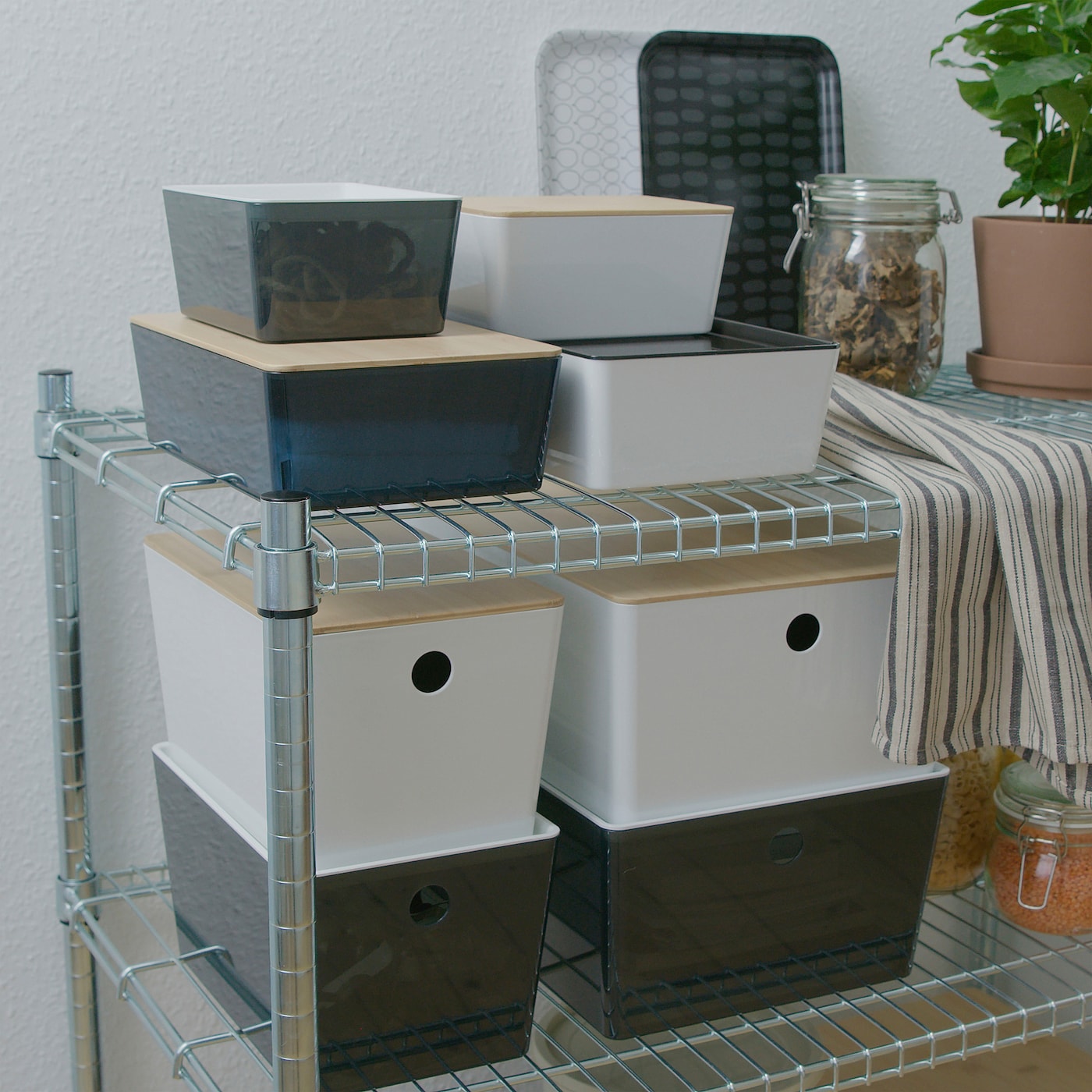 Эта глянцевая коробка с крышкой практична для организации документов, медиа-гаджетов и других предметов для хобби. Крышка защищает содержимое от пыли и позволяет ставить несколько коробок друг на друга.