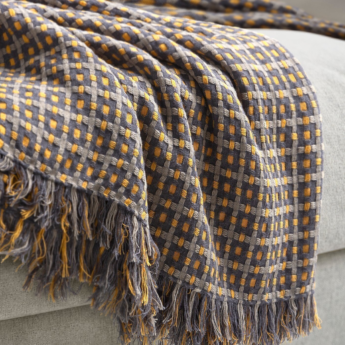 Этот плед желто-серого цвета с легкой текстурой, сотканный вручную, имеет минималистичный вид и излучает традиционное очарование. Дополните его несколькими подушками, чтобы создать уютную атмосферу на диване.