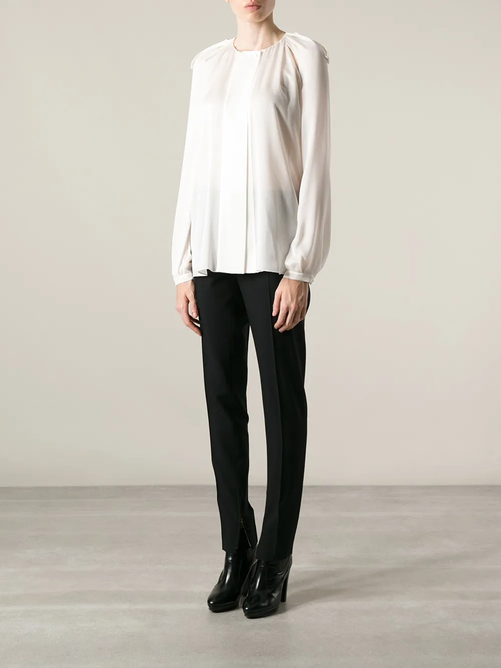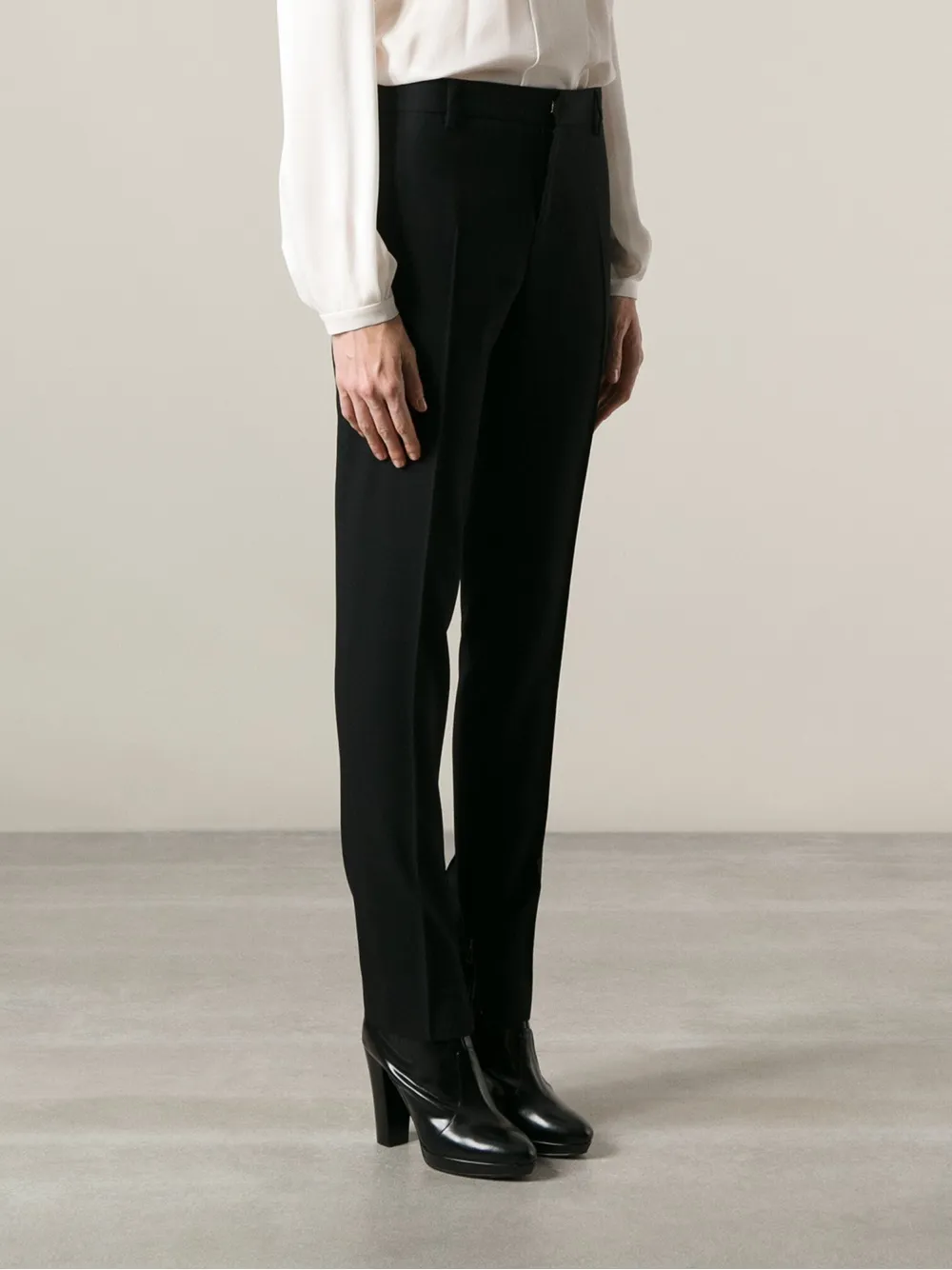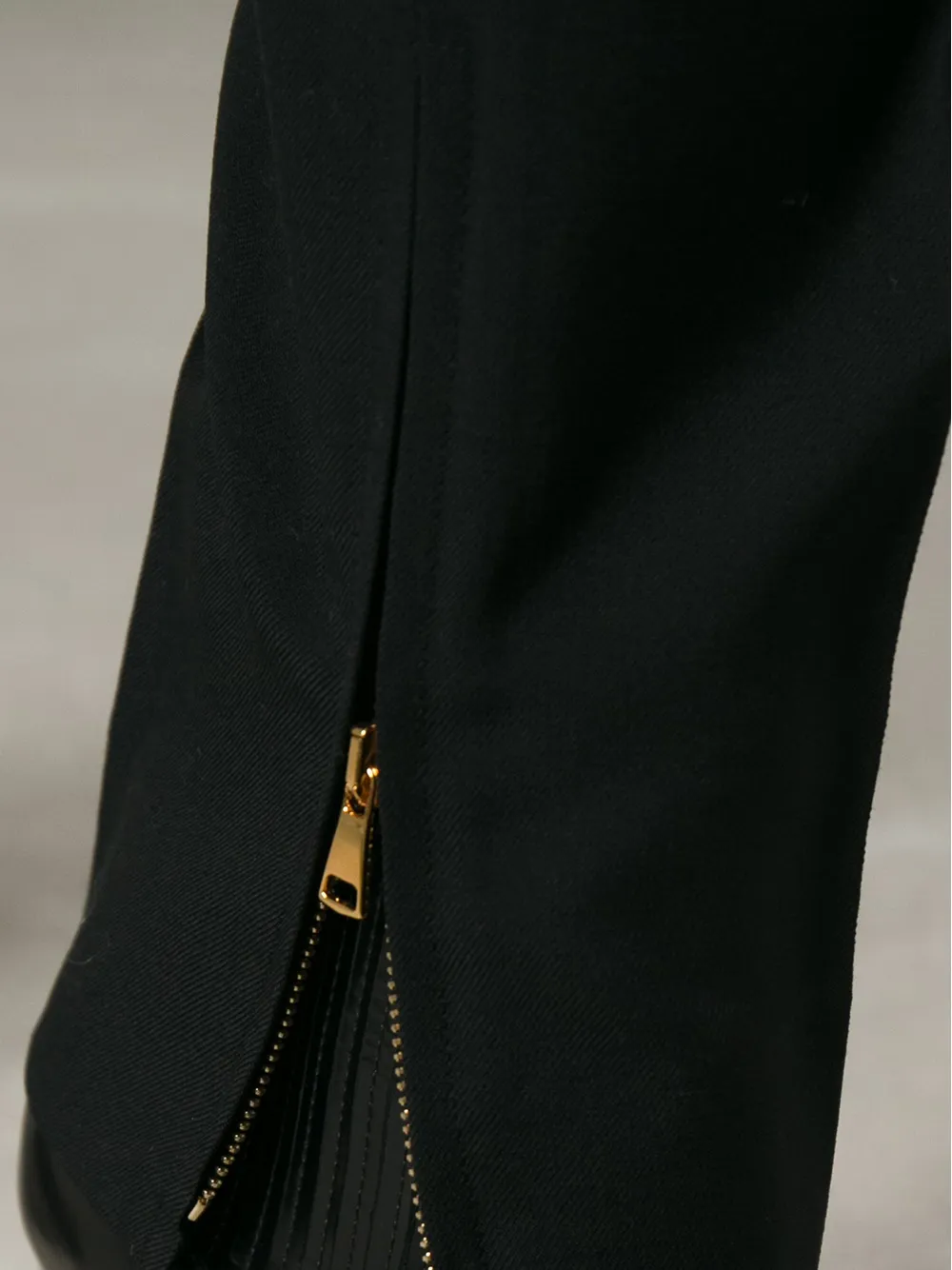 Черные шерстяные брюки с манжетами на молнии от Tom Ford. Пояс с петлями для ремня, потайная застежка спереди, задние карманы с листочкой, прямые брючины.