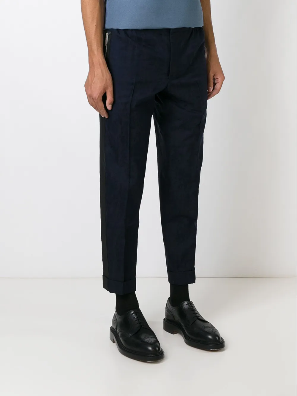 Темно-синие хлопково-шерстяные зауженные укороченные брюки от Alexander McQueen. Потайная застежка, карманы на молнии сбоку, полоски сбоку.