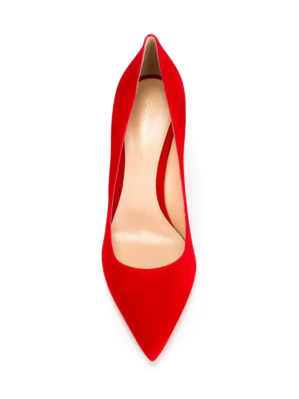 Красные замшевые туфли 'Gianvito' от Gianvito Rossi. Заостренный носок, фирменная стелька, шпилька средней высоты.