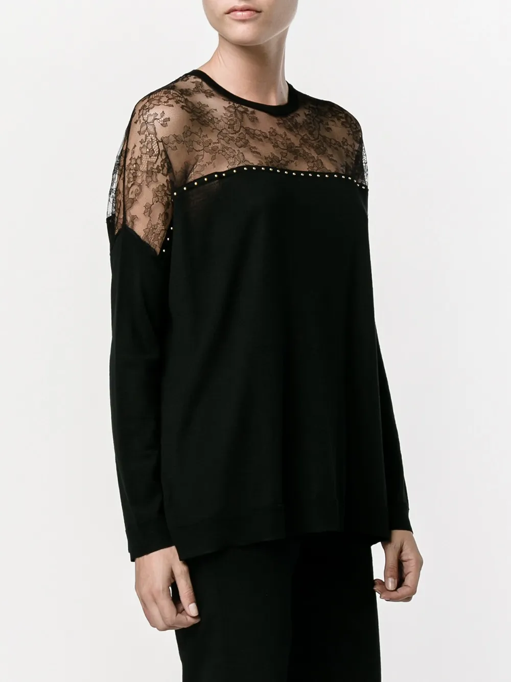 Черный шерстяной джемпер с кружевной панелью от Valentino(Валентино). Круглый вырез, узор из цветочного кружева, золотистые заклепки, приспущенные плечи, длинные рукава, подол и манжеты в рубчик.