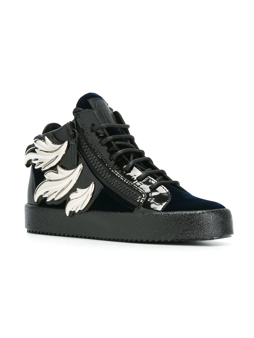 Черные хайтопы 'Cruel' из бархата и лакированной кожи от Giuseppe Zanotti Design. Миндалевидный носок, заплатка с логотипом на язычке, шнуровка спереди, застежки на молнии по бокам, плоская резиновая подошва.