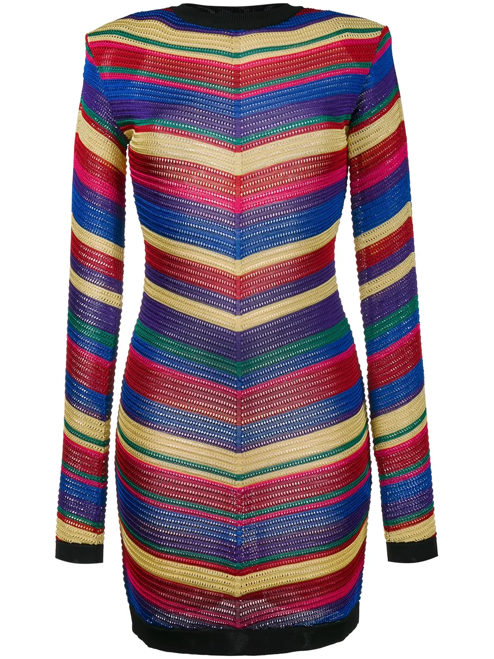 Разноцветное вязаное платье с ромбовидным узором от Balmain.