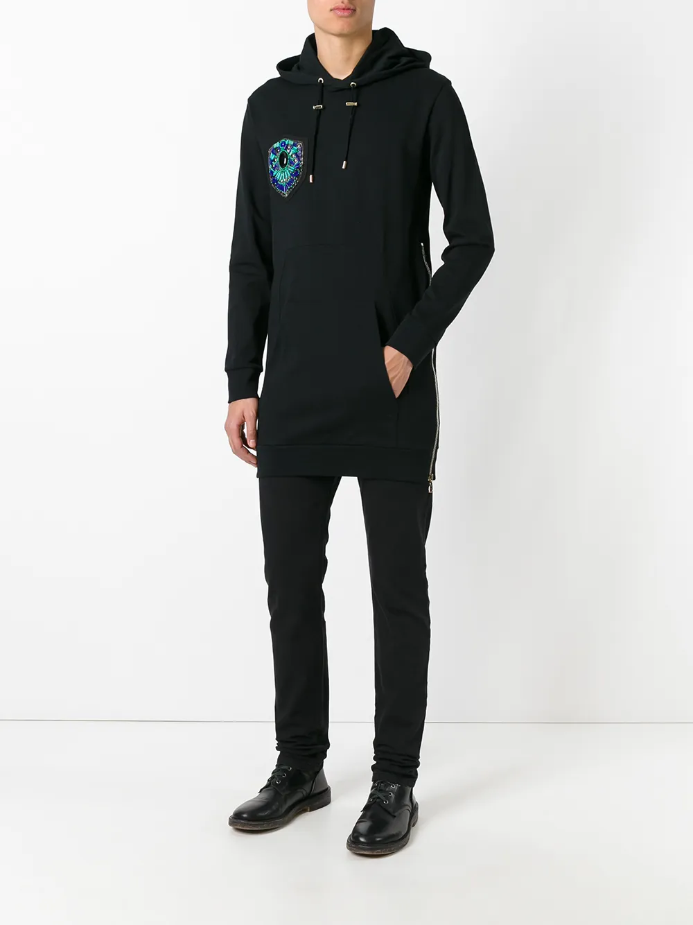 Черная хлопковая толстовка на молнии с капюшоном от Balmain. Капюшон на шнурке, отделка цепочкой по краю, украшение из бусин, карман-муфта, длинные рукава, удлиненная модель.