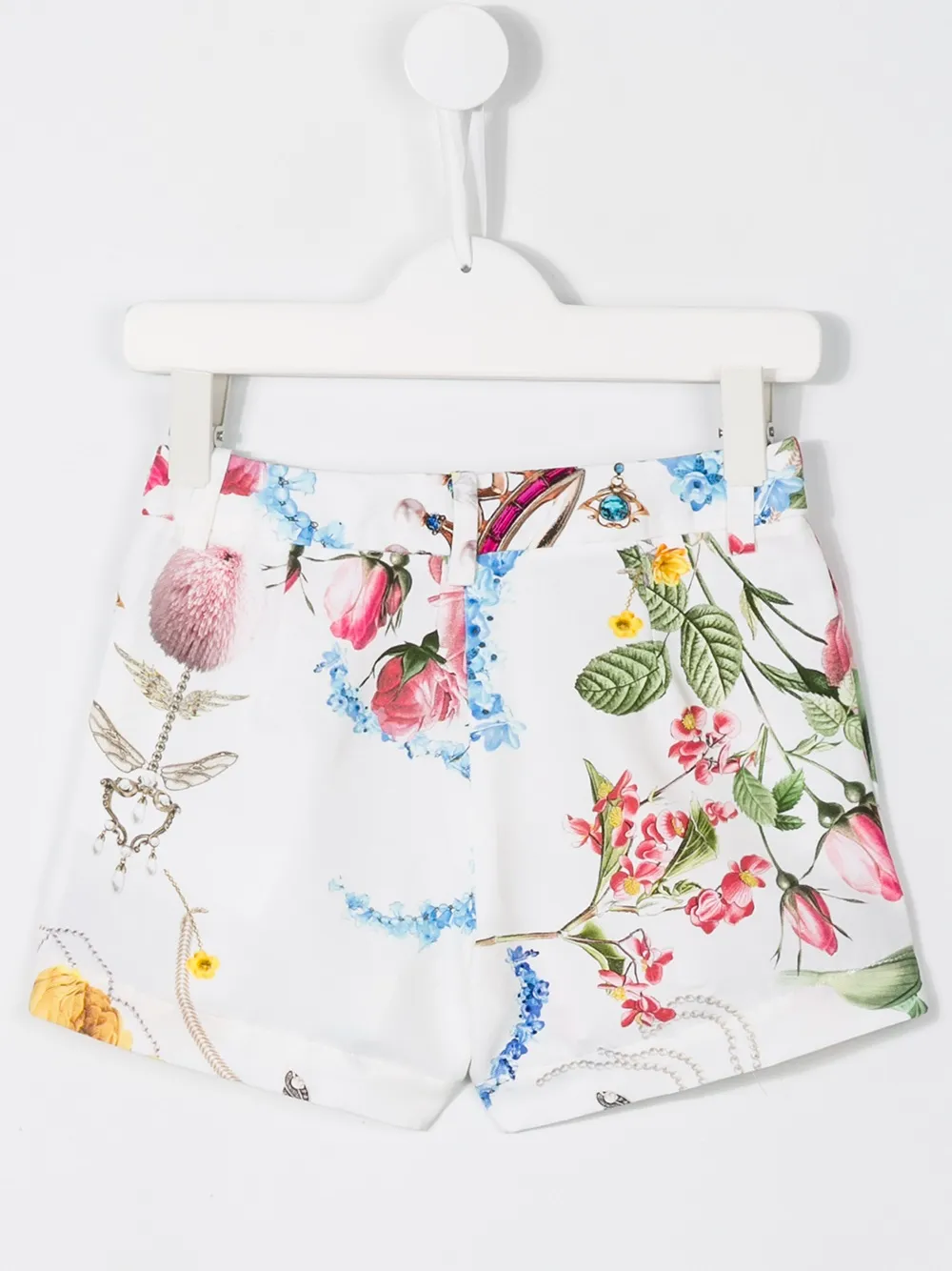 Белые хлопковые шорты с цветочным принтом от Monnalisa. Пояс с петлями для ремня, застежка на пуговице и молнии.